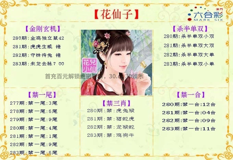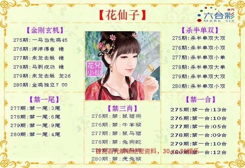279期:【八仙过海】 【一时勘破古通今,怨别徽黄是顺流,背人羞整六铢轻,三山浮海传连瀛】 解:意思是顺流解出水肖鼠猪,三山解出山肖鼠虎兔羊猴鸡猪 生肖:羊兔狗牛蛇马 |